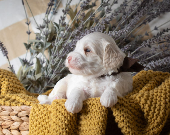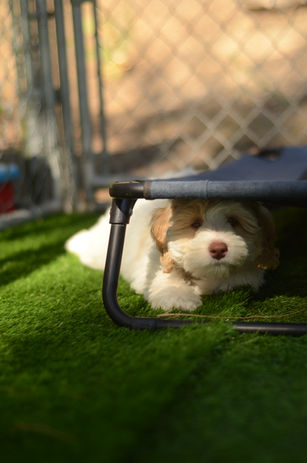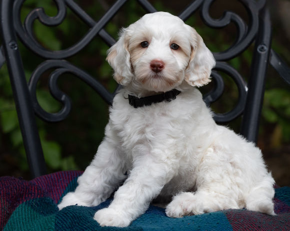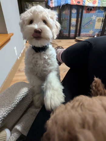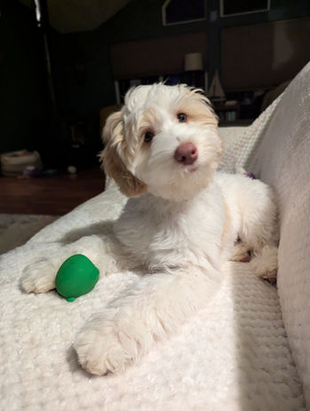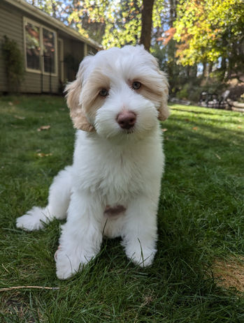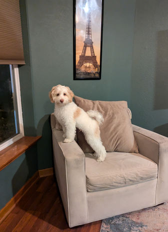 My oh my, Dale is a pretty boy! His mostly white coat is accented with soft caramel hints on his face and back, adding to his good looks. Dale is the biggest puppy still available from his litter, though he’s expected to stay in the miniature size range, weighing around 25 lbs. full grown. Dale has a mellow, gentle personality and has been a wonderful helper in socializing our younger litters, always playful and engaging, yet calm and patient. His favorite spot in the house is an armchair where he can watch the action below and jump in when the timing is right. After playtime, he happily returns to his cozy perch with a toy to quietly entertain himself. When it’s bedtime, Dale settles easily into his crate, and in the morning, he takes his time stretching, getting ready for the day. He’s such a sweet, well-mannered boy that during training, he often sits patiently waiting for his treat—thinking that’s exactly what you asked for. With a little patience and repetition, though, he’s mastered all his tricks beyond his signature “sit.” Dale is an easygoing, soft-hearted pup who would make a wonderful addition to any family—whether you’re looking for your first dog or a gentle playmate for your current pet. With his calm nature and affectionate temperament, he’d also make an excellent candidate for therapy work and would be wonderful with children.