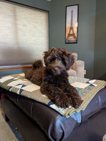 Meet Koda (Orange Ribbon Boy). Koda is the definition of sweet and gentle. With his endearing temperament and loving personality, this little guy melts hearts wherever he goes. Expected to weigh 18–22 lbs fully grown, Koda has a soft, light chocolate coat that may fade into a cafe color as he matures, but the real hook, line, and sinker are his beautiful hazel eyes. Playful and affectionate, Koda is always down for a treat and up for a good time. When he's had his fill of play, he hops up on the couch for snuggles and belly rubs. If you’re looking for a loyal companion with the kindest heart and the cutest face, Koda might just be your perfect match.