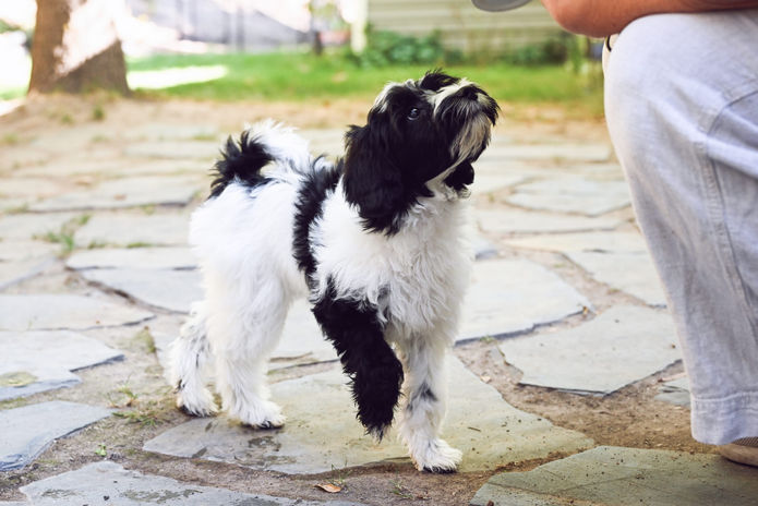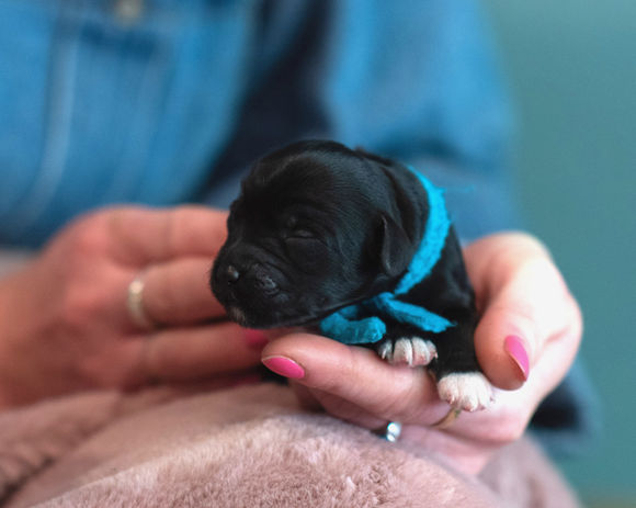 Meet Jasmine (Teal Ribbon Girl). What a pretty little lady Jasmine is! She has a soft, silky black coat with contrasting white markings on her chest and toes. Jasmine has such a joyful energy and loves to be part of the action, happiest wherever the fun is happening. She loves to play, make new friends, and share her affection with everyone she meets. Jasmine is our other girl who shows wonderful focus during training and treat time. She sits poised and ready to catch her reward every time! She is a quick learner and eager to please, paying attention to figure out how to earn her next treat. She’s expected to weigh around 20–25 lbs. full grown, making her a perfect little bundle of love and personality. Jasmine would make a wonderful companion for an active family or anyone looking for a playful, loving friend.