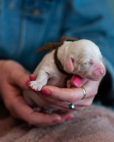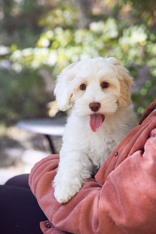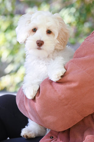 Meet Barron (Red Ribbon Boy). Oh, Barron—what a beautiful little boy! He is his daddy's mini-me in both looks and personality. Barron always has a toy in his mouth and proudly carries it wherever he goes. He’s a bright, eager-to-please pup who was the first in his litter to master “shake” at just six weeks old! Barron is a joyful, happy-go-lucky boy with a constant bounce in his step and a wag in his tail. He absolutely loves a good cuddle and belly rub and is content in just about any situation. His sweet temperament, soft coat, and expected adult weight of around 20 lbs. make him the perfect little package to bring home.